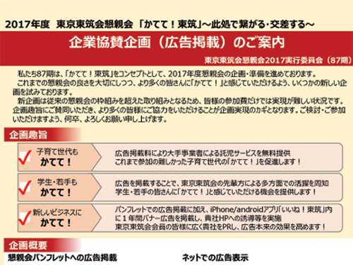 私たち87期は、「かてて!東筑」をコンセプトとして、2017年度懇親会の企画・準備を進めております。これまでの懇親会の良さを大切にしつつ、より多くの皆さんに「かてて!」と感じていただけるよう、いくつかの新しい企画を試みております。